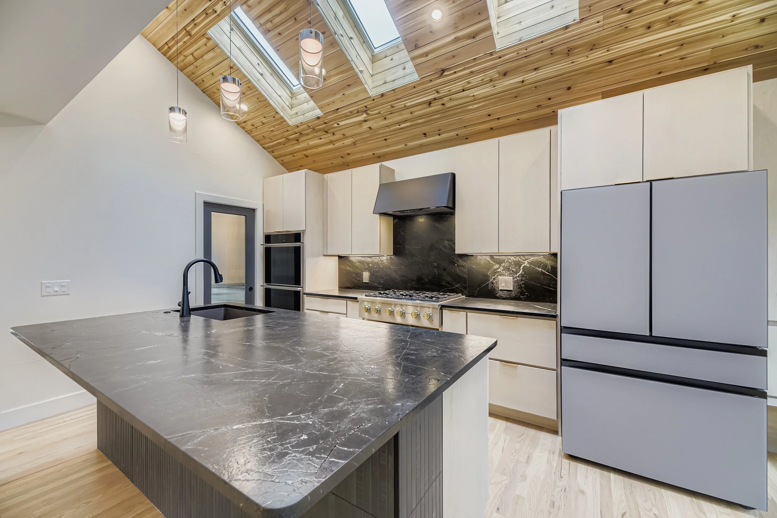 Nestled near a lake in Denver, Colorado, this modern asymmetrical pop-top renovation by NAGY Design transforms a modest single-story home into a light-filled architectural retreat. The reimagined main level introduces an expansive indoor-outdoor living experience that connects seamlessly to the surrounding landscape — perfect for family gatherings and everyday living.